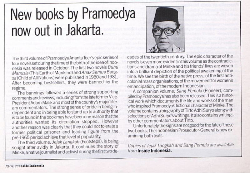 5. An article by Helen Jarvis 'Pramoedya banned again' (ed 8: Oct 1988).