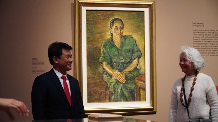 Bonnie Triyana standing in front of a portrait of Tanja Dezentjé (oil painting by Sudarso, 1947) /Bambang Ponco, Kabar Belanda, 25 February 2022