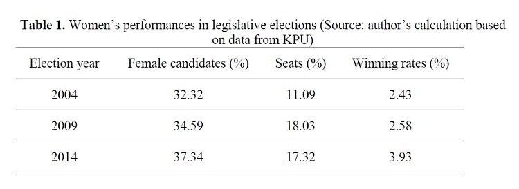 Semenjak kuota gender digulirkan pada tahun 2004, jumlah caleg perempuan di Indonesia terus mengalami kenaikan. Pada tahun 2004, terdapat kenaikan dari 32 persen menjadi 35 persen; dan kemudian meningkat menjadi 35 persen di tahun 2009; dan terakhir di tahun 2014 mencapai 37 persen. Sayangnya, konsistensi peningkatan ini tidak dibarengi dengan kenaikan angka keterpilihan perempuan (yaitu,jumlah perempuan terpilih dibagi total caleg perempuan) yang ternyata masih sangat lemah (Tabel 1). Di tahun 2014 misalnya, 2.467 perempuan dari total 6.607 calon bersaing untuk memenangkan 560 kursi di DPR. Namun hasilnya hanya 97 orang perempuan yang berhasil melenggang ke Senayan.